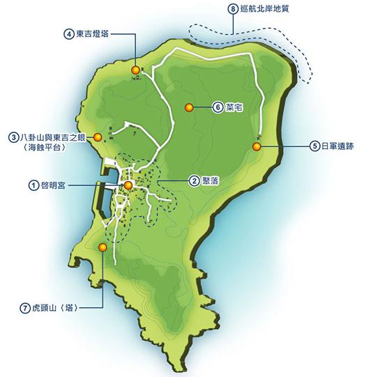 八卦山:位於東吉嶼碼頭的北側處的「八卦山」,看的到黃褐色圓形的微輝長岩鑲嵌於黑色柱狀玄武岩中,就像是朝向村莊望去的眼睛,守護著島上每位村民。因而又被稱為東吉之眼,也是進港時最醒目的地標,在這裡還可以俯瞰東吉村、東吉碼頭港跟鋤頭嶼。